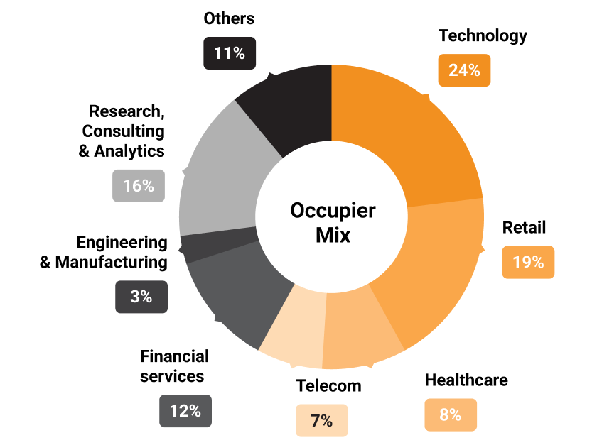 The park has a completed area of 12.9 msf and offers an integrated “business ecosystem” to its occupiers. It houses 69 tenants with more than 100,000 park users.