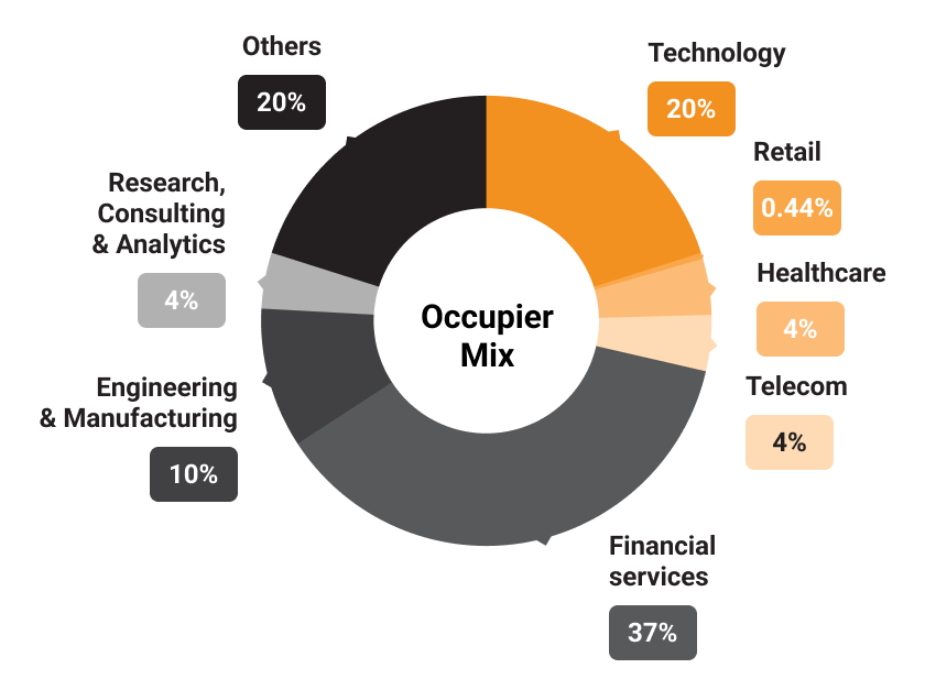 The park has a completed area of 9.2 msf and offers an integrated “business ecosystem” to its occupiers. It houses 43 tenants with around 60,000 park users.